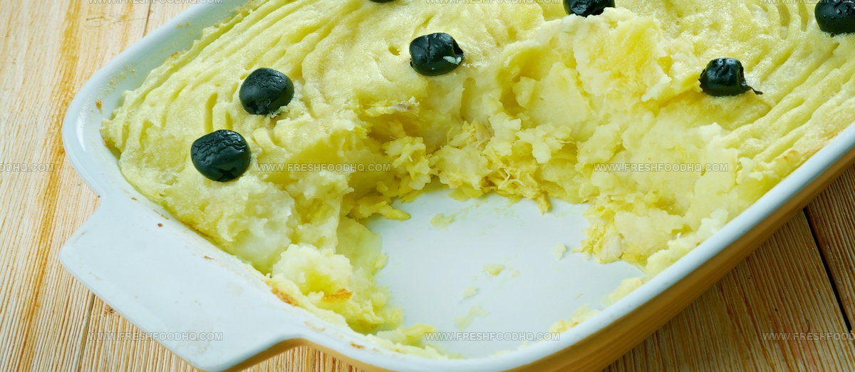 Potatoes get mashed and spread across the top, creating a golden-brown crust when baked in the oven.