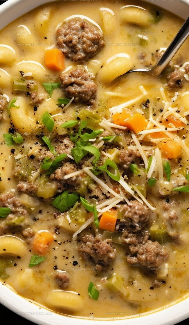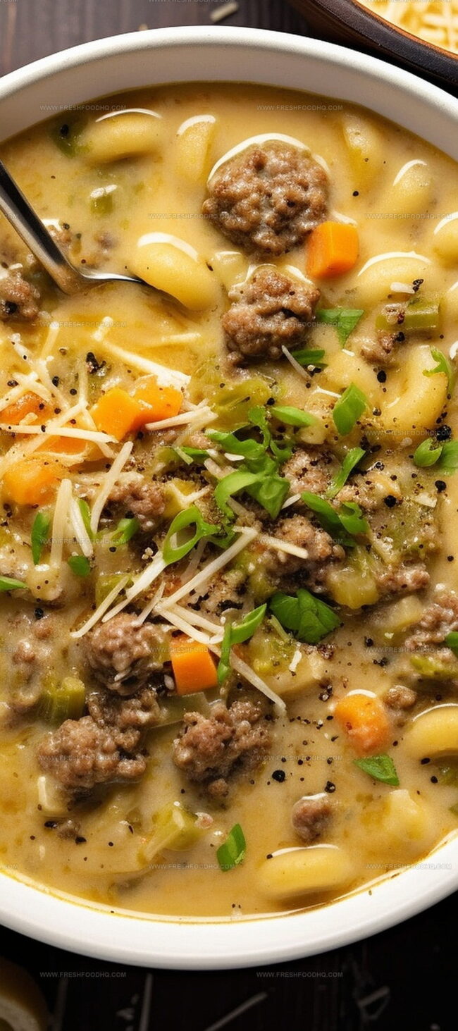 This soup combines the flavors of a cheeseburger with classic macaroni and cheese, featuring ground beef, aromatic herbs, and a creamy cheese base that creates a unique and comforting meal.