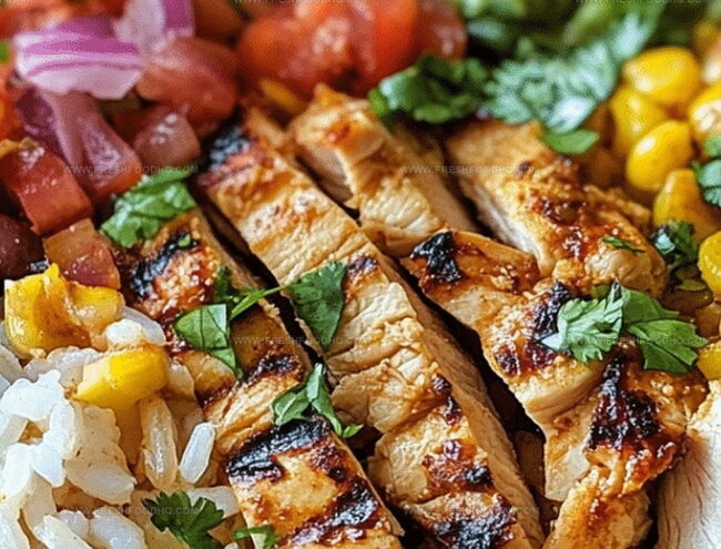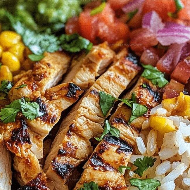 Slice the grilled chicken into tasty strips. Create your bowl by layering rice, beans, and chicken. Go wild with toppings like: