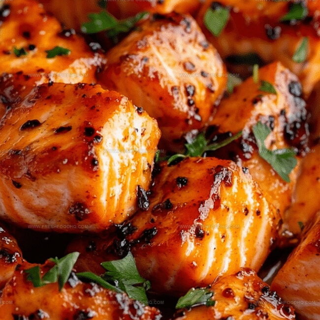 Once the salmon bites are done, gracefully drizzle the hot honey sauce over them. Sprinkle some freshly chopped parsley on top for a pop of color and herbal freshness.