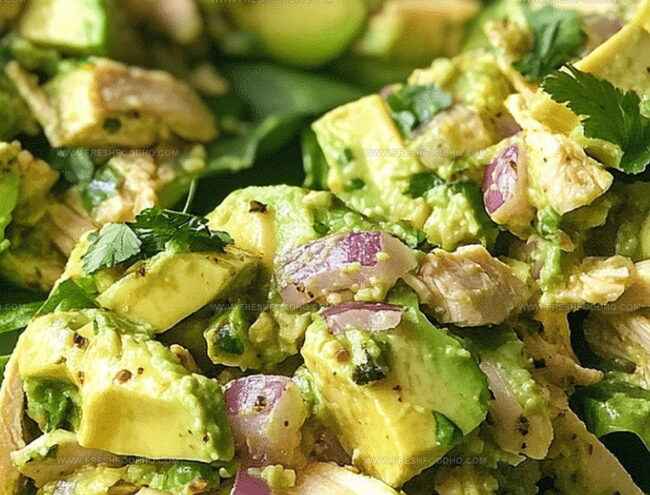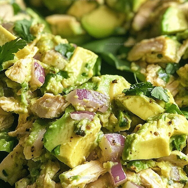 Creamy chunks of ripe avocado mingle perfectly with tender, seasoned chicken pieces.