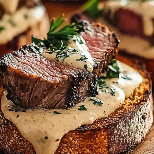 Tender medallions of premium beef nestle atop golden-toasted bread, promising an extraordinary appetizer experience.
