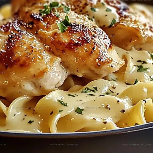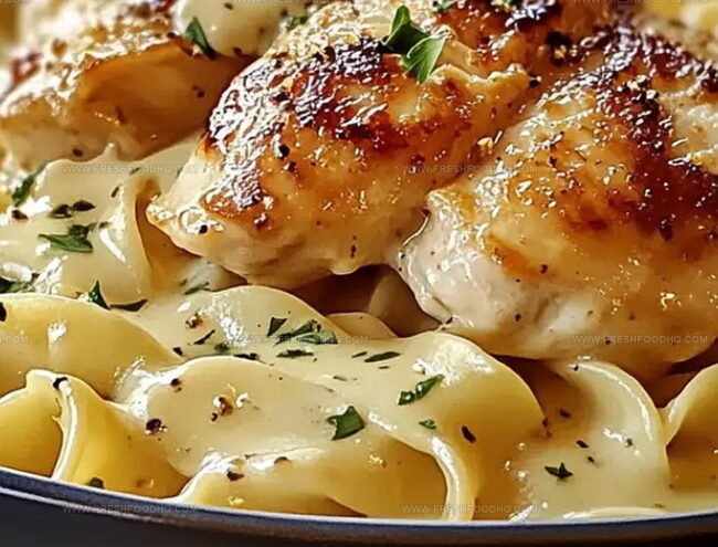 Succulent chicken nestled on buttered noodles creates a comforting meal that whispers pure satisfaction.