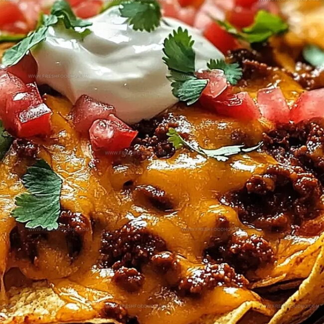 Spicy Mexican-inspired Chili Cheese Nachos blend zesty flavors with crispy tortilla chips, melted cheese, and hearty chili. Comfort food perfection awaits you in this crowd-pleasing dish that promises delicious satisfaction with each savory bite.