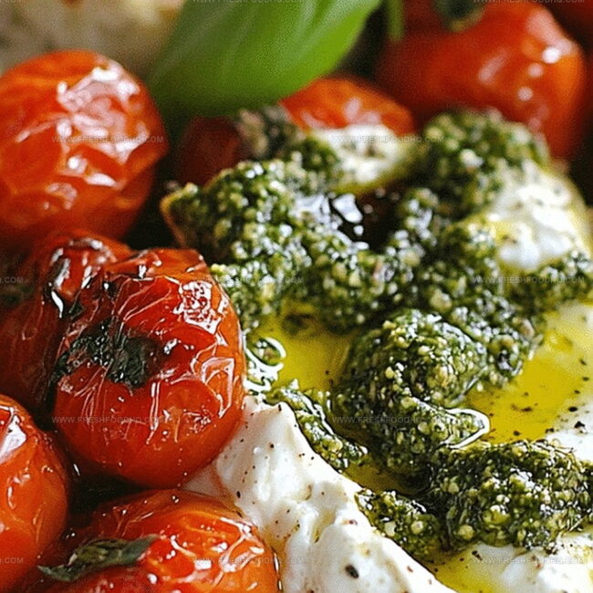 Carefully scatter the roasted cherry tomatoes over the pesto, letting their sweet juices mingle with the herbal green sauce. If you’re feeling fancy, drizzle some balsamic glaze for an extra flavor punch. Sprinkle fresh basil leaves on top for a beautiful pop of color and herbal aroma.