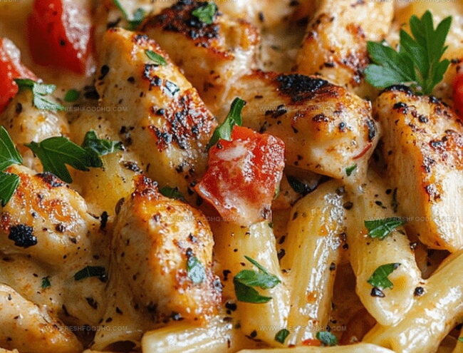 Tender chicken strips nestle among perfectly cooked pasta, each bite delivering a warmth that feels like a passionate kitchen embrace.