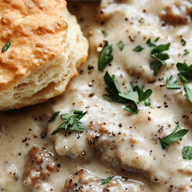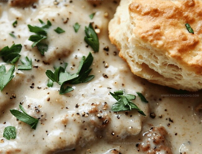 Hearty Southern “Creamy Sausage Gravy with Buttery Biscuits” brings comfort straight from home kitchens. Rich, peppery gravy cascades over flaky homemade biscuits, promising a satisfying breakfast that welcomes you to savor pure Southern hospitality.