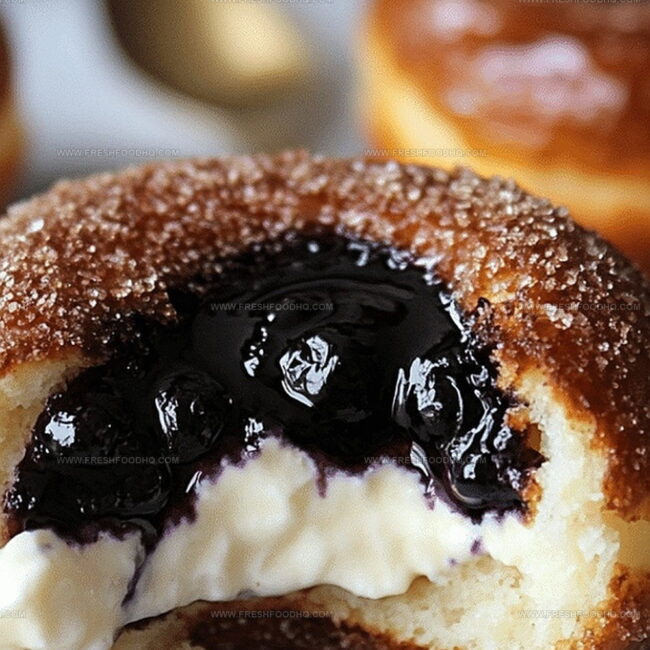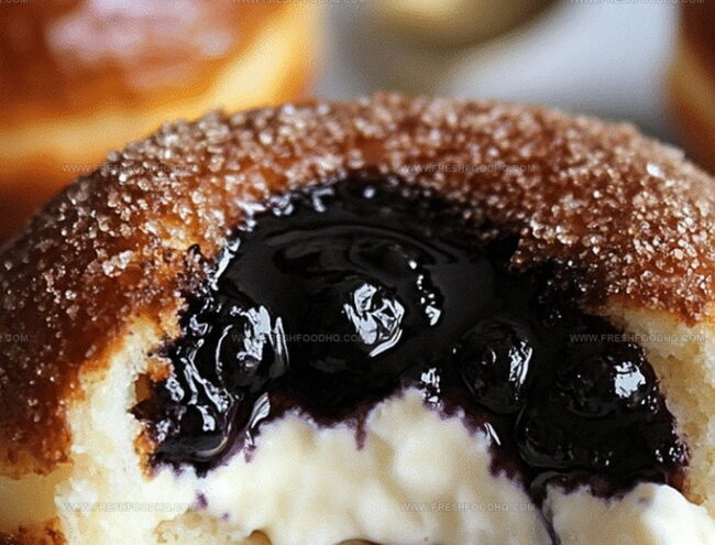Irresistible homemade doughnuts with balsamic blueberry and cheesecake filling bring gourmet dessert magic to your kitchen. Sweet-tangy blueberry compote and creamy cheesecake nestled inside golden-fried dough will make you crave more with each delectable bite.