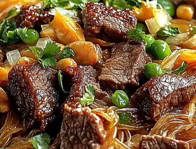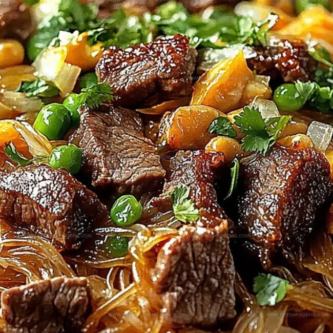 - Drain soaked noodles thoroughly and gently fold them into the beef and vegetable mixture, ensuring even distribution and complete coating with the pan’s aromatic liquid.