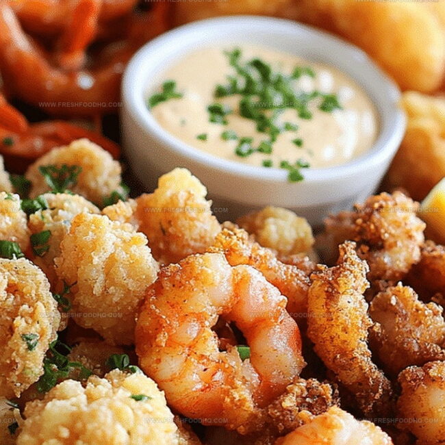 Arrange golden seafood on a large serving platter. Garnish with fresh lemon wedges. Serve immediately alongside homemade tartar sauce and zesty cocktail sauce for dipping.