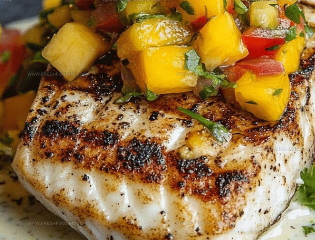 - Transfer perfectly grilled fish to serving plates, generously dollop tartar sauce alongside, and crown with vibrant mango salsa.