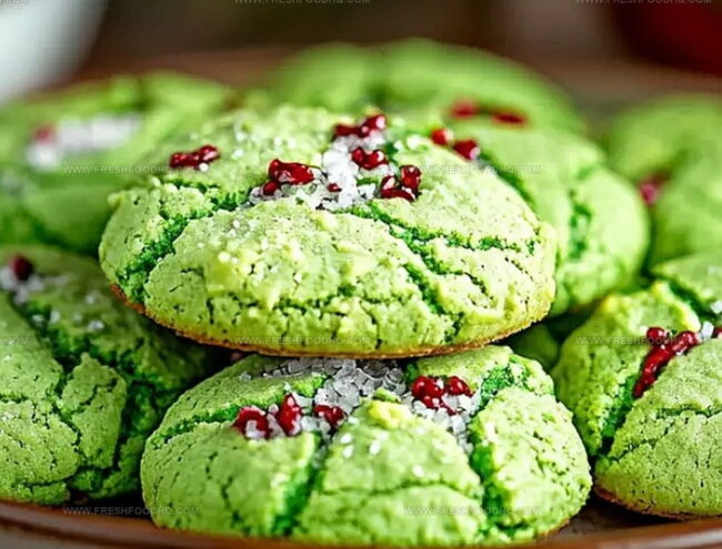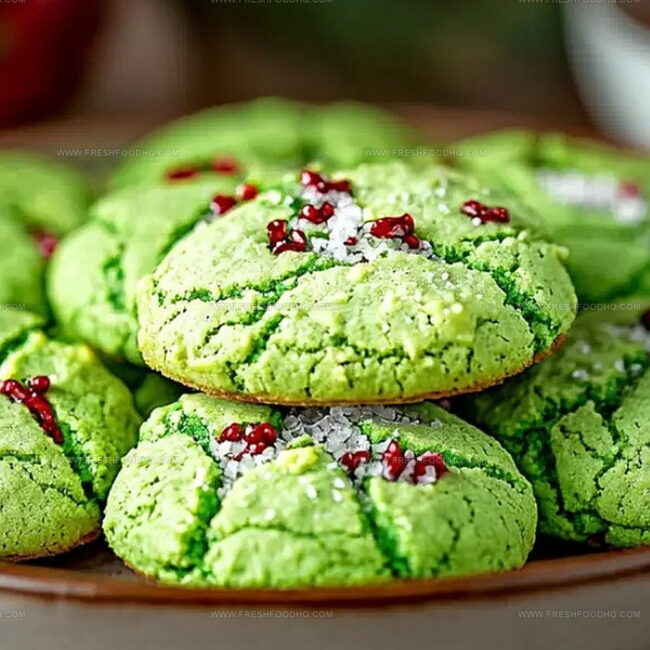 Festive green Grinch cookies bring holiday cheer with their whimsical charm and vibrant appearance. Crackly sugar-coated edges and bright green hue invite you to indulge in a playful Dr. Seuss-inspired treat that sparks joy and nostalgia.