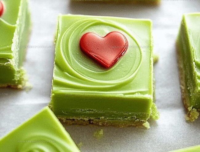 - Add festive flair by delicately placing red heart sprinkles on each fudge square for a whimsical Grinch-inspired presentation.