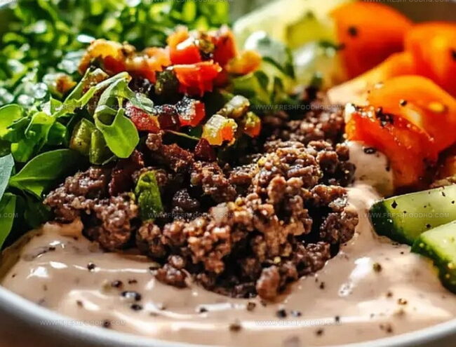 - Construct flavor-packed bowls by creating a verdant base of crisp, chopped romaine lettuce. Generously distribute the seasoned ground beef across the leafy foundation. Artfully arrange sliced avocado, thinly sliced red onion, tangy pickles, and vibrant cherry tomatoes atop the meat. Elegantly cascade the prepared burger sauce over the assembled ingredients.