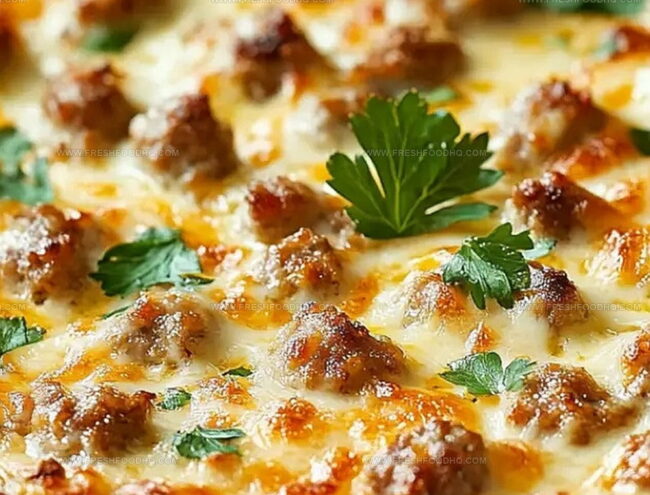Melted cheeses blend seamlessly with zesty sausage crumbles.