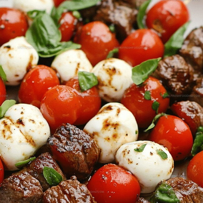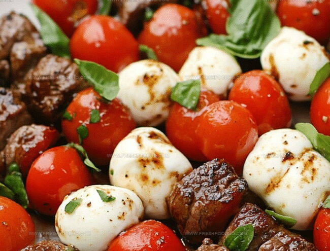 Juicy marinated beef chunks nestle between creamy mozzarella and bright basil leaves.