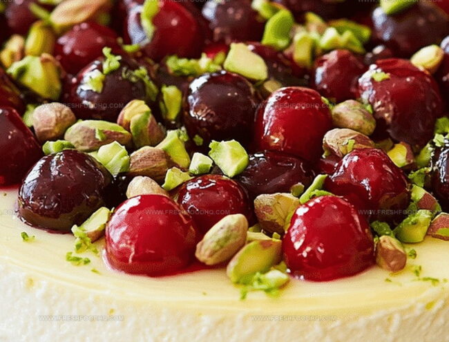 Indulgent “Luscious Lemon Lime Cherry Pistachio Cheesecake” brings Mediterranean zest to classic dessert traditions. Creamy layers of tangy citrus and sweet cherries nestle between nutty pistachio crumbles, inviting dessert enthusiasts to savor each luxurious bite.