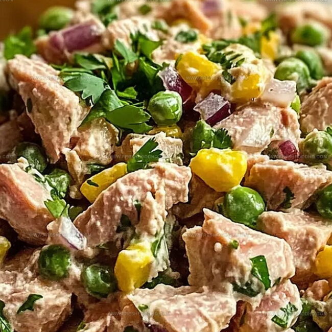 - Incorporate finely diced red onion, crisp green apple, sweet corn kernels, tender peas, and tangy sweet gherkin pickles into the tuna base.