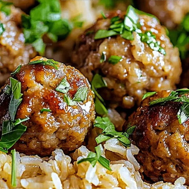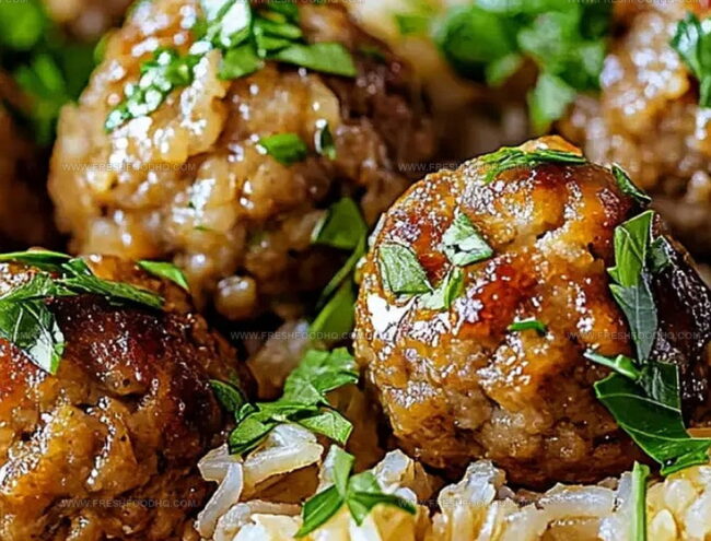 Succulent homemade meatballs dancing atop fluffy rice create a comforting meal that sparks memories of grandmother’s kitchen.