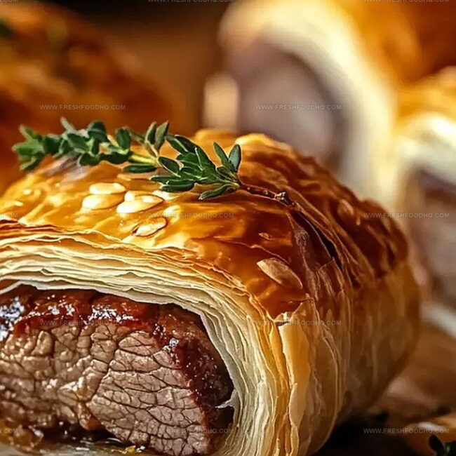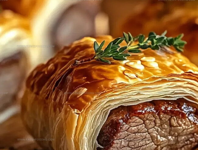 Perfectly cooked beef nestles inside flaky puff pastry, promising a luxurious culinary experience.