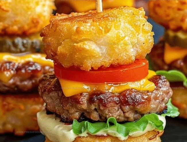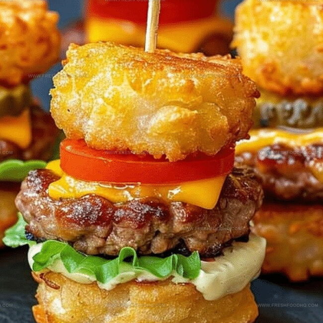 Crispy mini tater tot cheeseburgers merge classic American comfort food with playful party-style bites. Juicy beef, melted cheese, and golden potato nuggets create an irresistible snack you’ll crave at game day gatherings or casual celebrations.