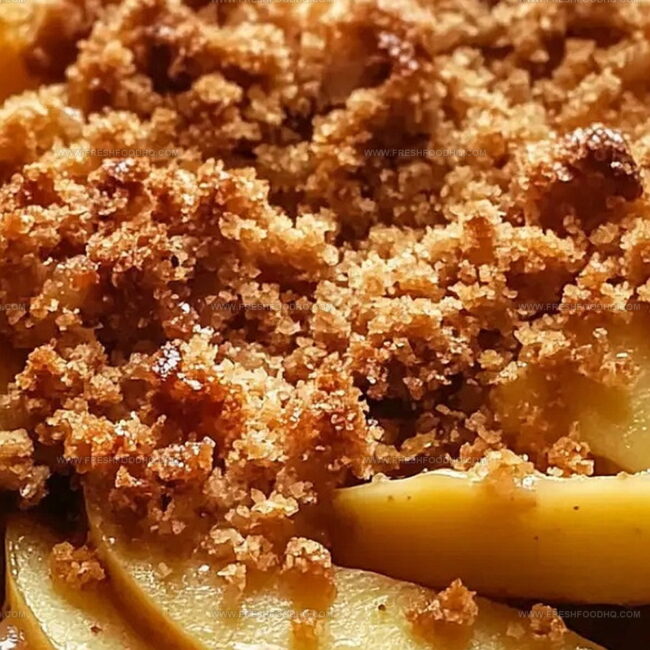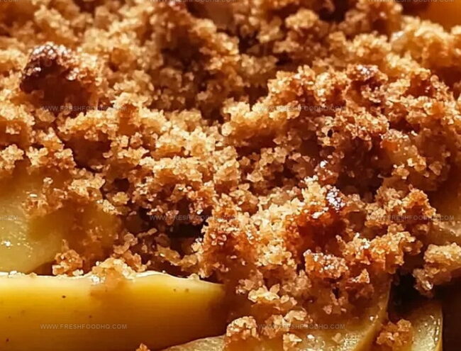 Ripe orchard fruits nestle beneath a golden, crumbly topping that promises delicious satisfaction.