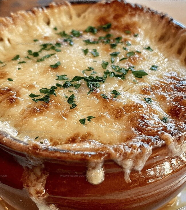 Top each soup bowl with a crispy slice of toasted French bread. Then create a delicious cheese blanket by layering:Step 6: Broil to Perfection