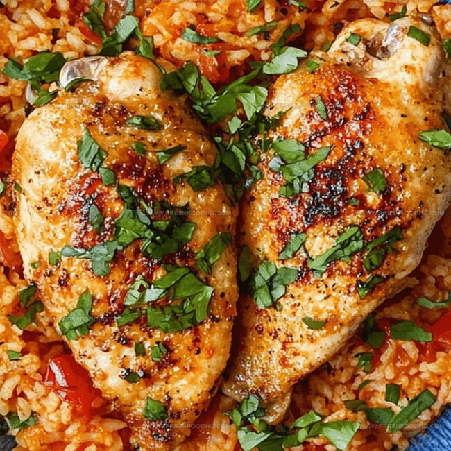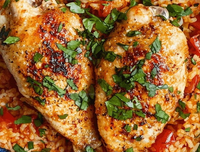 Rich tomato rice complements the juicy chicken with classic comfort.