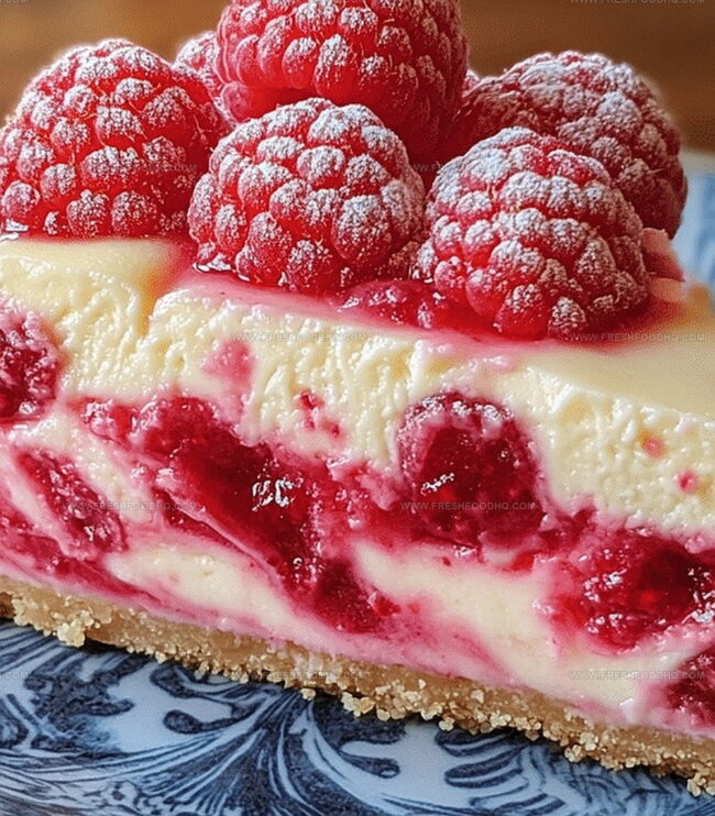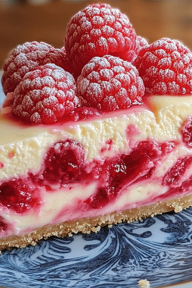 Sweet summer memories dance through this luscious raspberry ripple cheesecake slice, blending creamy richness with tangy fruit elegance. Silky layers and buttery graham cracker crust invite you to savor each delightful Mediterranean-inspired bite.