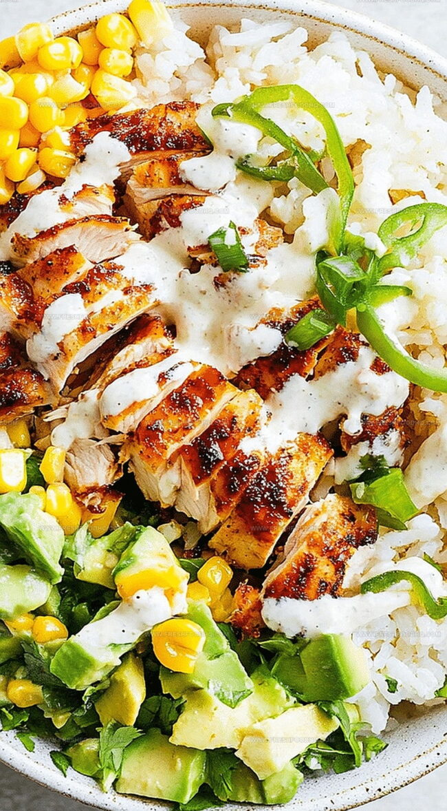 - Layer the rice bowl strategically: spread rice as the base, artfully arrange sliced chicken atop the grains, scatter roasted corn throughout, and generously drizzle with the vibrant sauce.