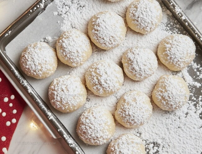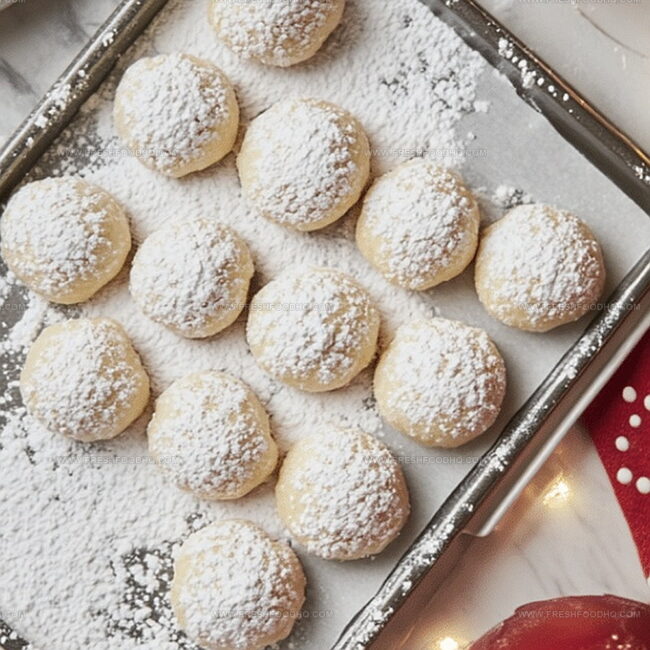 - Remove from oven and briefly allow cookies to rest, then delicately roll each warm cookie in powdered sugar for a luxurious, snowy coating.