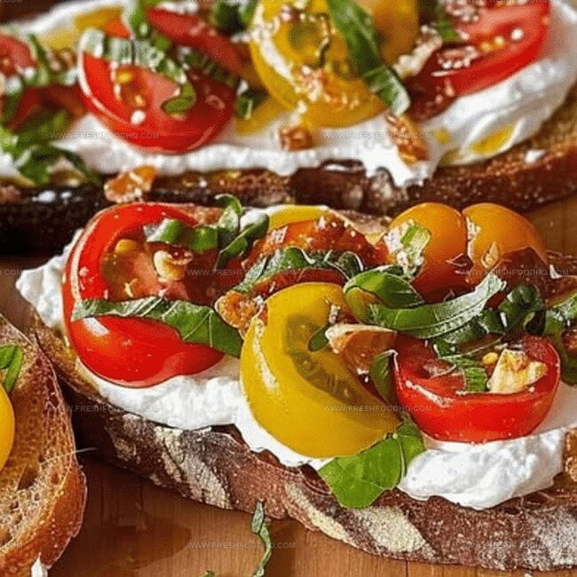 Summer’s zesty “Tomato Crostini with Whipped Feta” brings Mediterranean freshness to your table. Crisp bread, creamy cheese, and juicy tomatoes create a perfect bite of Italian-inspired elegance you can savor in minutes.