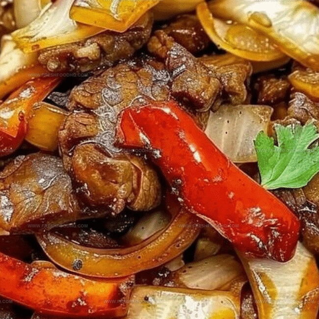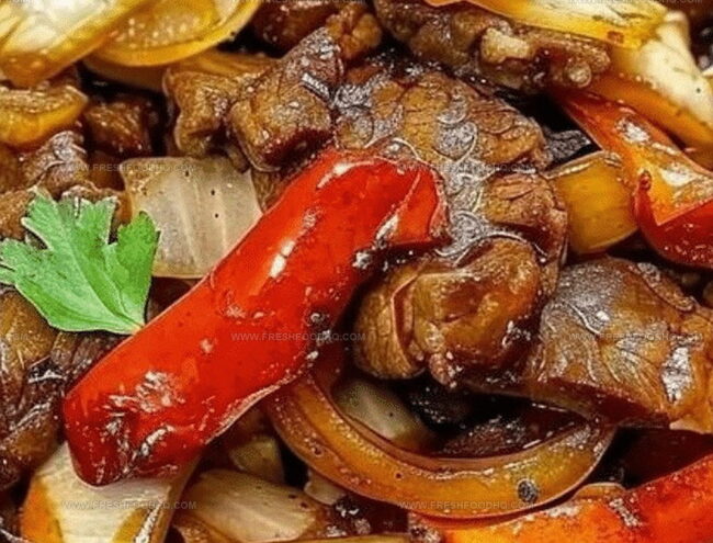Vibrant red and green bell peppers complement succulent meat strips with remarkable depth.
