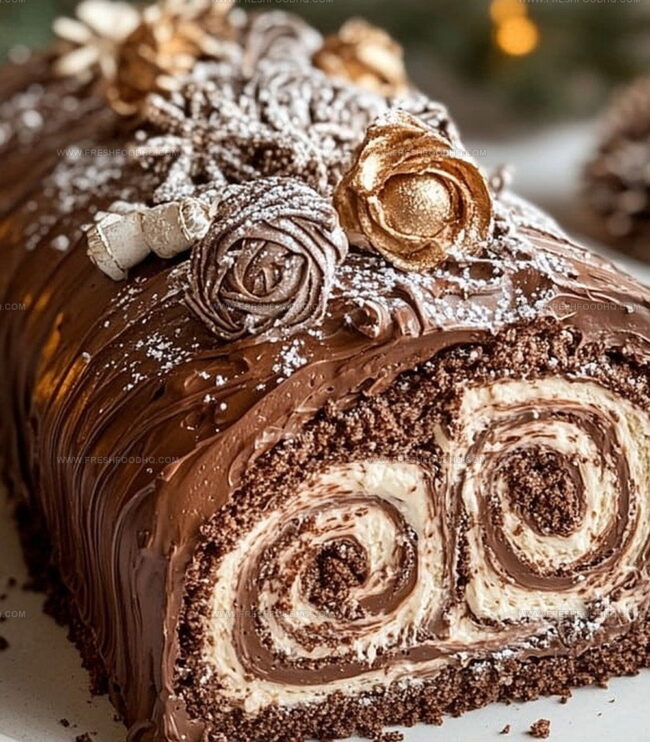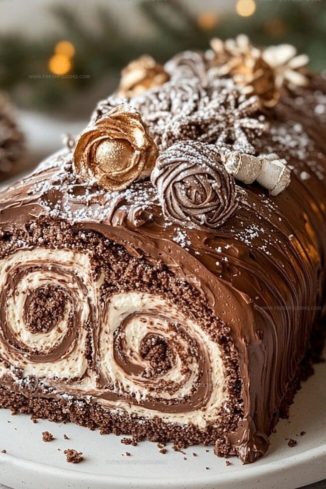 Festive Chocolate Yule Log brings European holiday magic to winter celebrations. Creamy chocolate buttercream and delicate sponge cake roll together into a woodland-inspired dessert that delights you with seasonal charm.