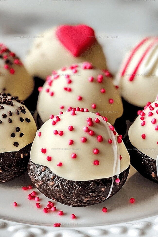 Sweet chocolate-drenched valentine oreo truffles melt hearts with their irresistible blend of crushed cookies and cream cheese. Rich chocolate coating and playful sprinkles create a romantic dessert perfect for sharing with someone special.